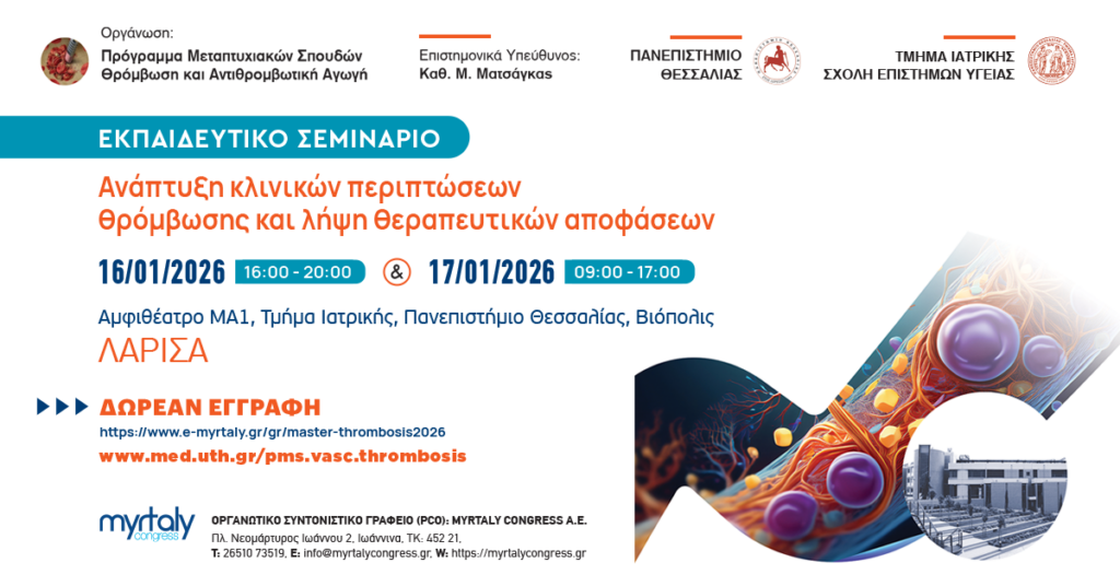 Η εγγραφή είναι δωρεάν και πραγματοποιείται στον παρακάτω σύνδεσμο: https://www.e-myrtaly.gr/gr/master-thrombosis2026